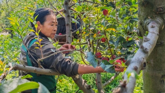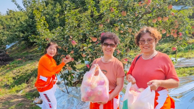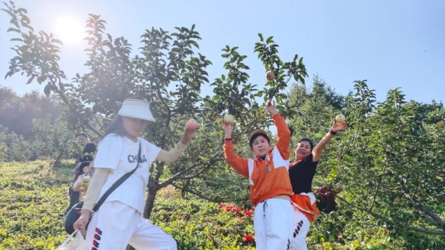 “前面那片果园是村民富东家的,小长假这几天的游客特别多,走,我带你过去看看。”石文镇连刀村党支部书记刘凤君说。记者在富东家的果园里看到,大大小小的果树随山就势,成片不成行,形成了高低起伏、相映成趣的画面,从清原过来的两大客车游客分散在参差错落的林间,兴致勃勃地采摘着苹果,欢笑声响彻在林间。