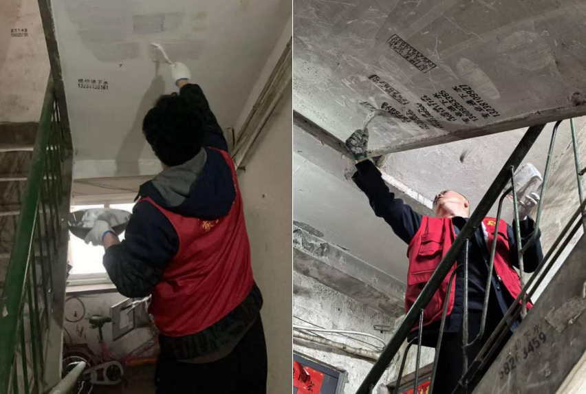 在活动现场,志愿者们与社区工作人员分工协作、默契配合,全面开启楼道“美颜”模式。针对楼道墙面、扶手、电表箱等处的各类小粘贴、“牛皮癣”广告,大家逐一用铲刀细致铲除,针对拓印在墙面上的顽固广告,志愿者们利用大白涂料对其进行粉刷覆盖。